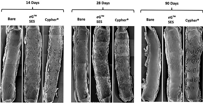 Scanning electron microscope (SEM) pictures at 14 days, 28 days and 90 days of the cross-section of rabbit iliac arteries implanted with a bare metal stent (316L), the same stent coated with a p-BUMA eG™ layer + PLGA layer loaded with 1.2 μg/mm2 of sirolimus [eG™ Sirolimus Eluting Stent (SES)], and the Cypher® stent by Cordis, loaded with the same amount of sirolimus. In all pictures, post-dilatation diamaters are 3.0 mm