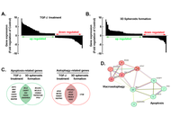 3D spheroids exhibited decreased AKT phosphorylation, and increased TGF-β, fibronectin, and Smad2 phosphorylation, indicative of both cell death signaling and epithelial-mesenchymal transition molecular signatures. 2-Deoxy-D-glucose (2DG), a glycolytic inhibitor, depleted ATP dose-dependently (30–300 μM) and prevented those increases both at the protein and transcriptional levels. This was also observed in 3D spheroids upon TGF-β transient siRNA-mediated silencing or when TGF-βR1 kinase activity was inhibited by galunisertib. Transcriptomic profiling revealed shared upregulation of apoptosis-related (BCL2, CASP7, FAS, FASLG, GADD45A) and autophagy-related (ATG7, ATG16L1, IRGM, PIK3C3, ULK1) genes in response to TGF-β or upon 3D spheroid formation. 2DG, transient silencing of TGF-β, or galunisertib treatment prevented these increases.