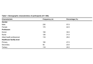 A cross-sectional survey was conducted between December 2024 and February 2025 among 400 healthcare professionals (doctors, nurses, and allied health practitioners) working in primary, secondary, and tertiary facilities in Swabi and Mardan. Participants were recruited using purposive, stratified (quota-based) sampling. The questionnaire captured knowledge/awareness, attitudes, self-reported utilization, and perceived barriers (infrastructure, training, and privacy). Descriptive statistics were produced, and multivariable regression was used to examine factors associated with utilization.