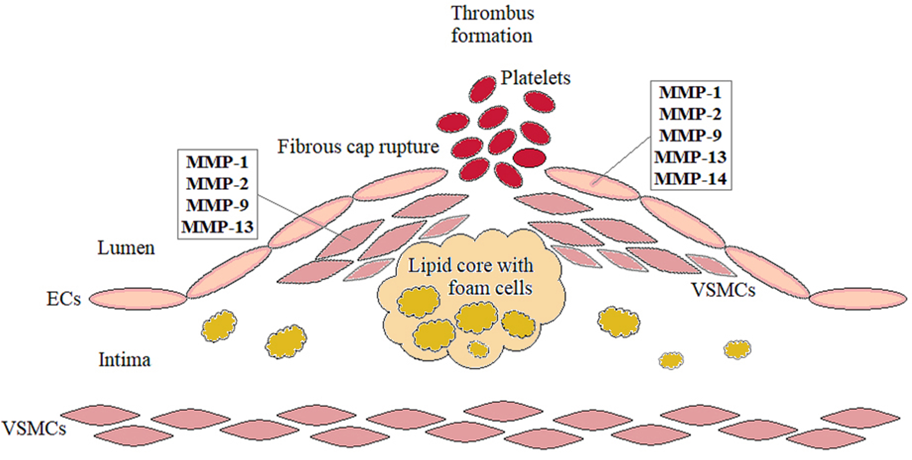 Figure 1. The role of MMPs in the fibrous cap rupture during the progression of atherosclerosis leading to potentially life-threatening sequelae. ECs: endothelial cells; VSMCs: vascular smooth muscle cells