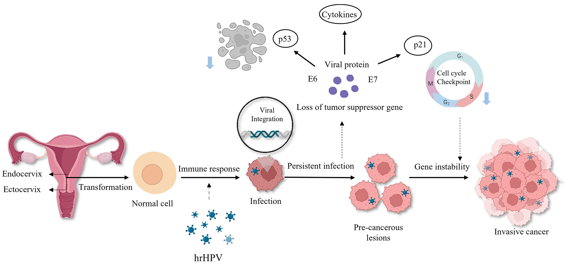 Figure 1. Pathophysiology of cervical cancer. In the regular cells, when affected by the action of high-risk HPV (hrHPV), precancerous cells are formed, which reduces gene stability, leading to the cause of cervical cancer. Created with BioRender.com