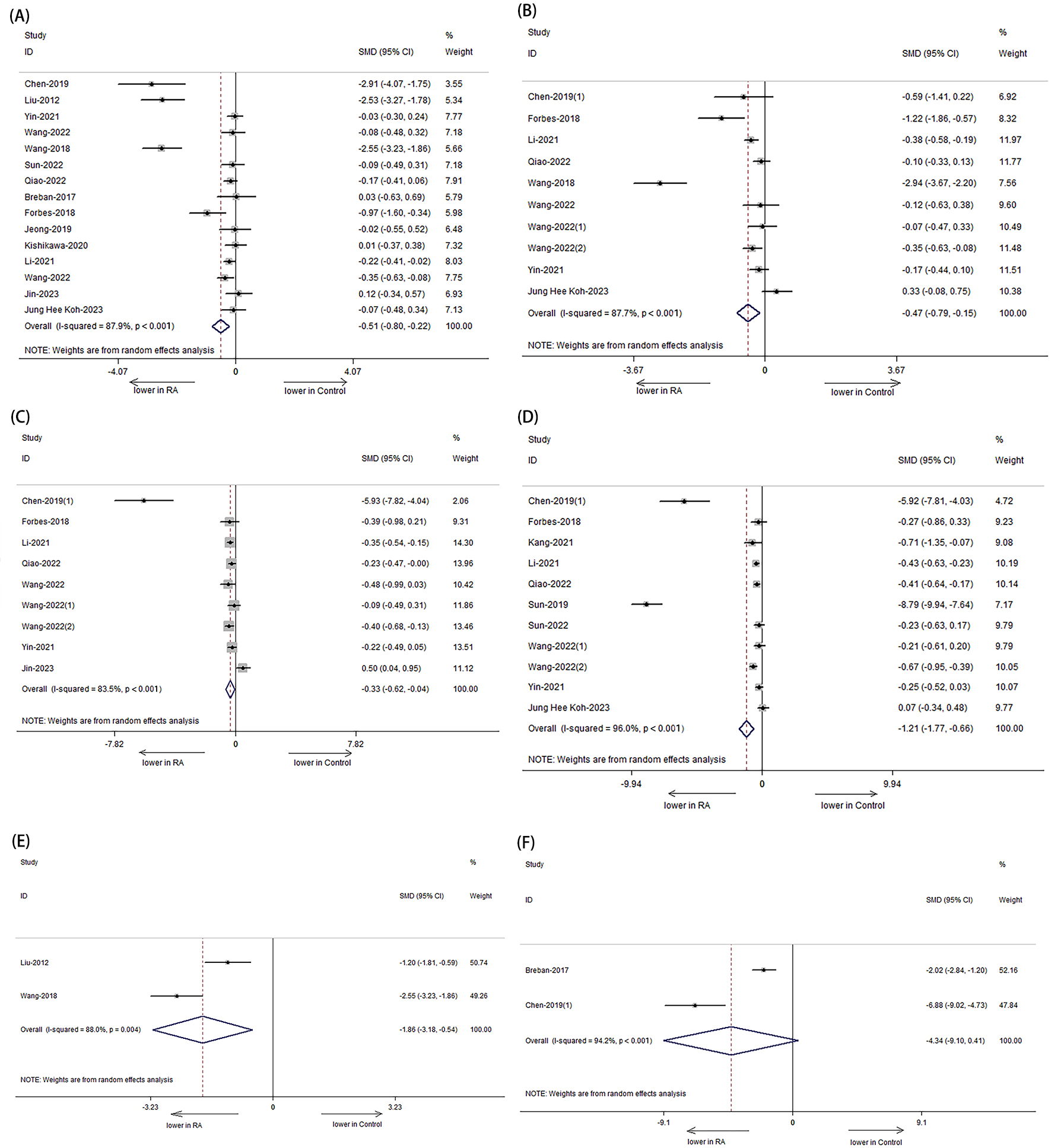 Forest plots of alterations in the α-diversity of patients with RA versus HCs. (A) Shannon index; (B) Simpson index; (C) ACE; (D) Chao1; (E) evenness index; (F) observed species. Compared to HCs, the Shannon index, Simpson index, ACE, Chao1, and evenness index of RA patients showed a significant decrease