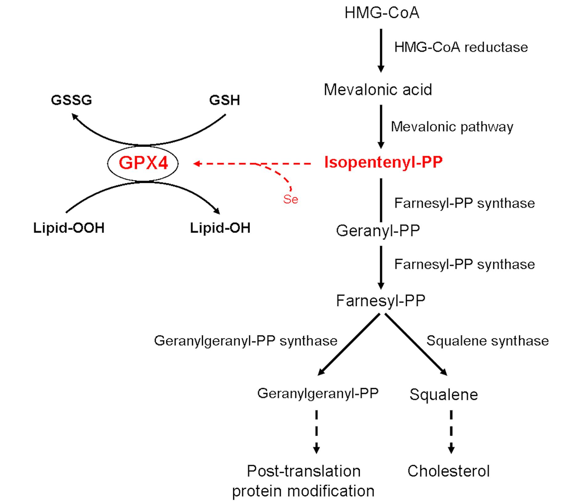 Schematic description of the relationship between glutathione peroxidase 4 (GPX4) and isopentenyl-diphosphate (isopentenyl-PP) synthesis and metabolism. Farnesyl-PP: farnesyl-diphosphate; Geranyl-PP: geranyl-diphosphate; Geranylgeranyl-PP: geranylgeranyl-diphosphate; GSH: glutathione; GSSG: glutathione disulfide; HMG-CoA: 3-hydroxy-3-methylglutaryl coenzyme-A; Lipid-OH: lipid alcohol; Lipid-OOH: lipid peroxide; Se: selenium. Solid arrows indicate the sequence of the enzymatic reactions whereas dashed arrows indicate the final biological event