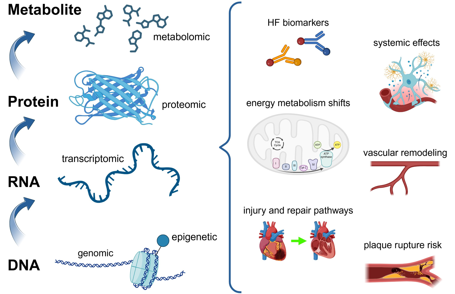 Overview of multi-omics data as the foundation for AI in studying cardiac biology. From bottom to top: genomic data provides insights into the DNA sequence and variations; epigenetic data reflects chromatin modifications and regulatory changes; transcriptomic data captures RNA profiles and gene expression patterns; proteomic data characterizes protein structure, function, and interactions; metabolomic data reveals cellular metabolic states. The multi-omics layers on the left side of the figure collectively identify key pathways, metabolic changes, and protein interactions, which are depicted on the right side as critical components of cardiac biology and disease mechanisms. AI: artificial intelligence; HF: heart failure; TCA: tricarboxylic acid; Cyt C: cytochrome C. Created in BioRender. Sabry, Z. (2025) https://BioRender.com/t20l803