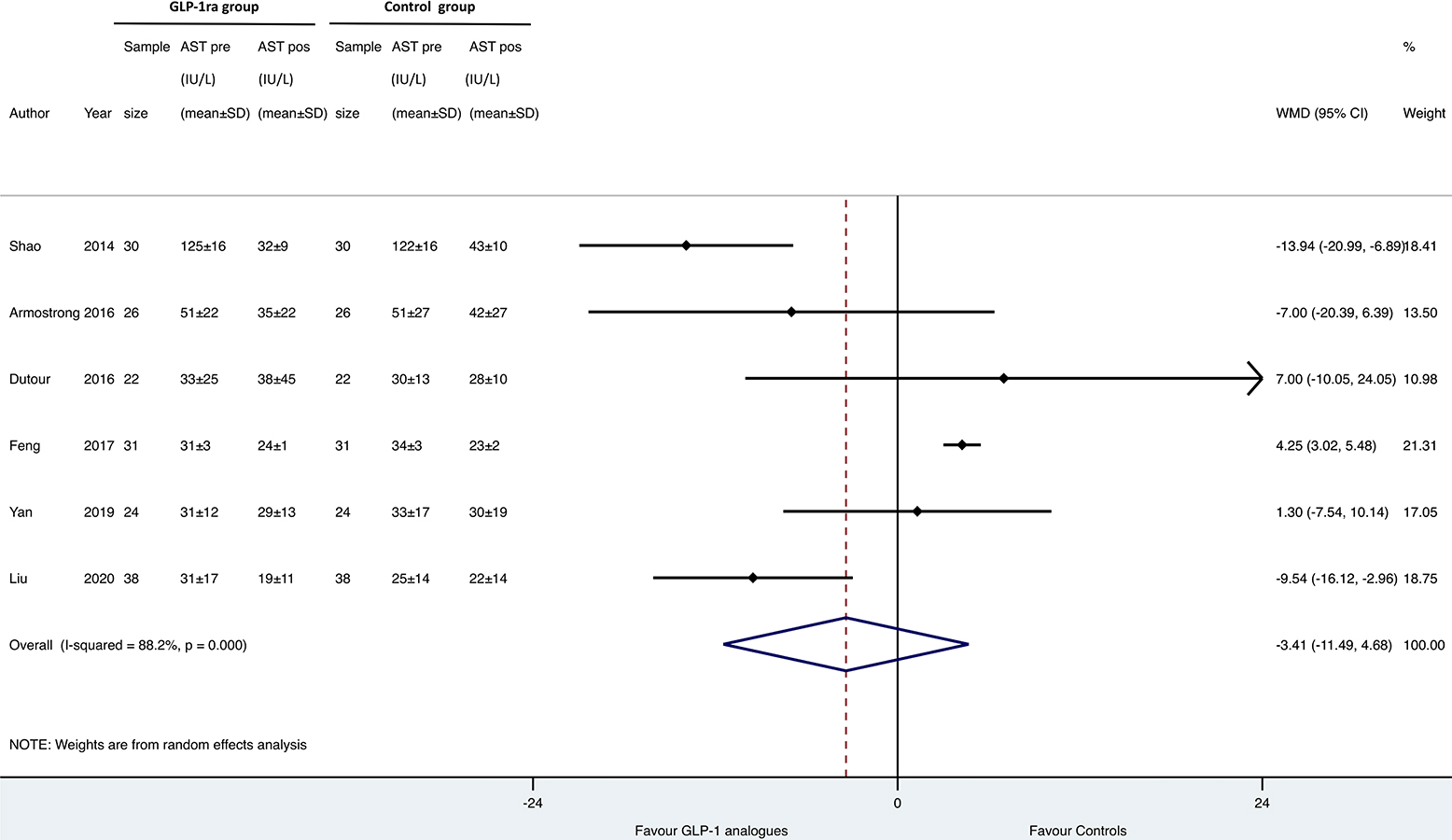 Figure 2. Forest plot and pooled estimates of the effect of GLP-1 RAs on changes in serum aspartate aminotransferase (AST) levels of in the eligible RCTs (n = 6). The effect size was expressed as WMD and 95% CIs