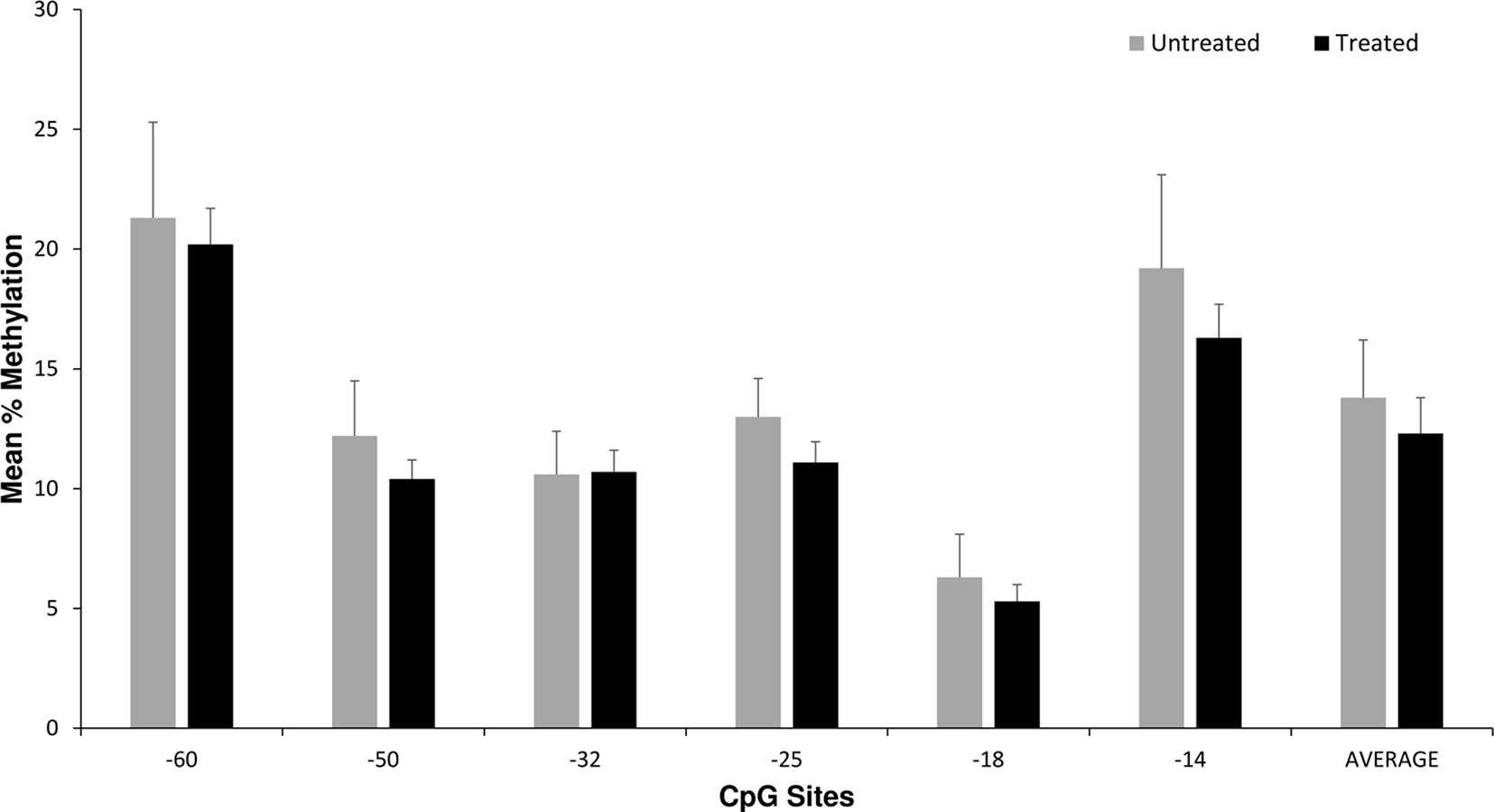 Placenta OPRM1 DNA methylation and NOWS pharmacologic treatment. Average placental OPRM1 methylation levels for CpG sites for the 64 opioid subjects based on NOWS pharmacologic treatment (n = 49) versus no treatment (n = 15). There were no statistically significant differences in univariate or multivariate analyses