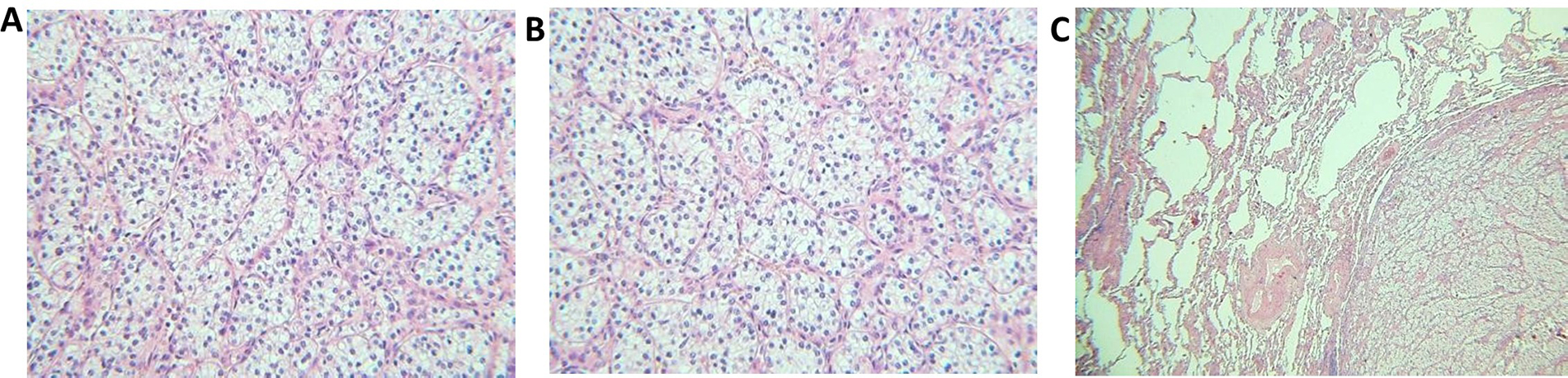 Histopathological images of the tumors. (A) Clear-cell RCC, primary tumor (40× magnification); (B) clear-cell RCC, primary tumor (40× magnification); (C) pulmonary metastasis of RCC (20×, magnification)