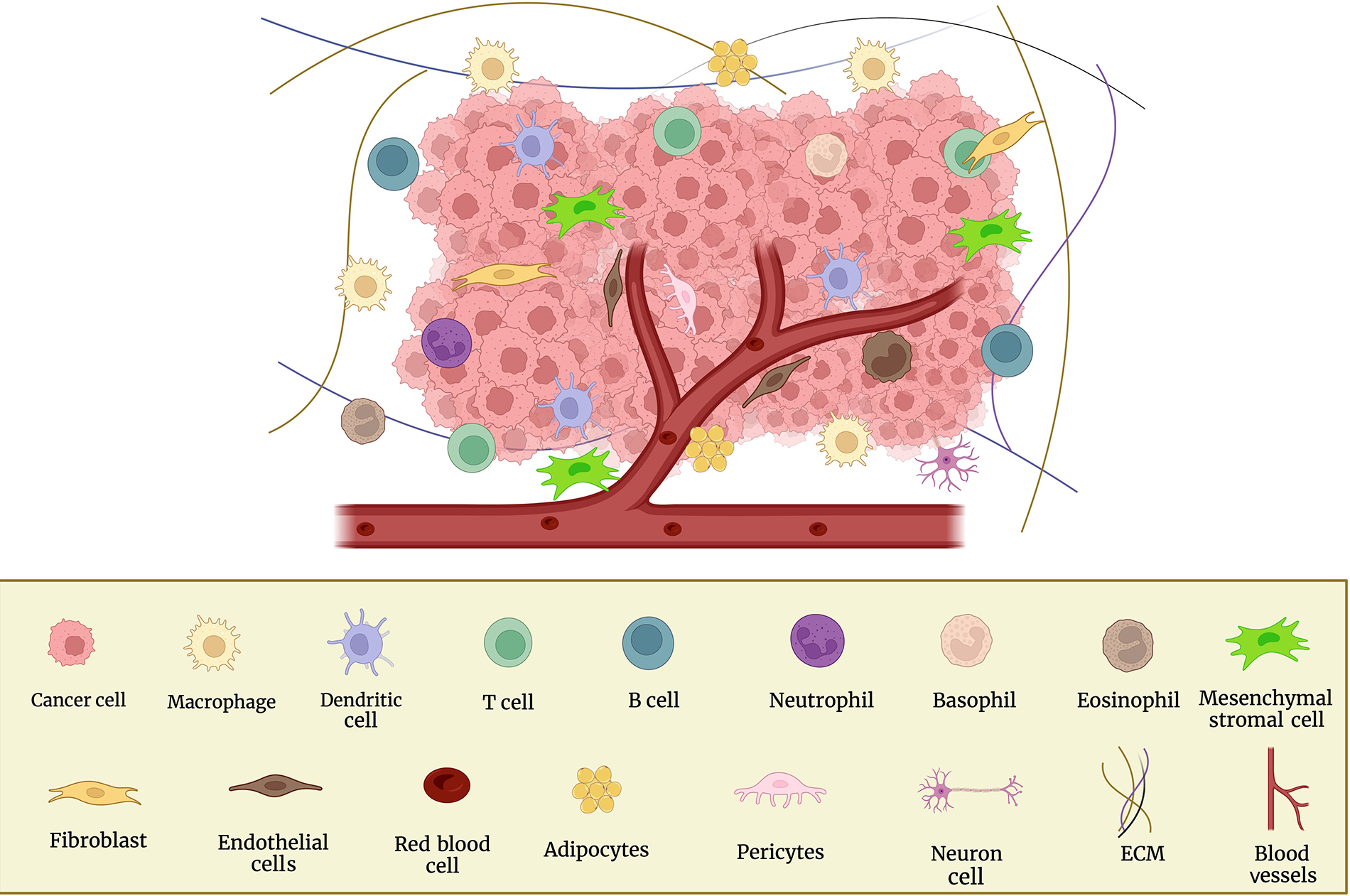 Cellular components of the TME and surrounding BC cells. This figure was created with BioRender