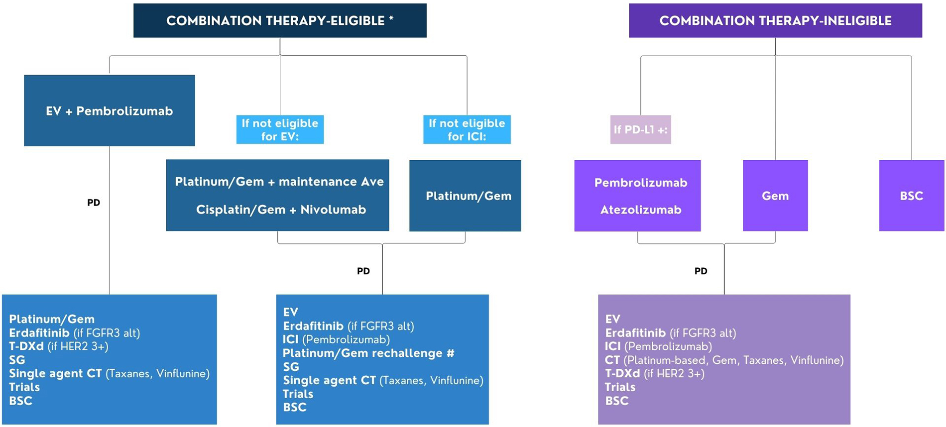 Flow chart for the management of patients with advanced/metastatic urothelial cancer. * Combination therapy eligibility: ECOG PS 0-2, GFR ≥ 30 ml/min, adequate organ functions; # Rechallenge with platinum/Gem if progression occurred ≥ 12 months after the end of previous platinum-based CT or ≥ 12 months after the end of previous platinum-based CT and maintenance avelumab. Alt: alterations; Ave: avelumab; BSC: best supportive care; CT: chemotherapy; EV: enfortumab vedotin; FGFR: fibroblast growth factor receptor; Gem: gemcitabine; ICI: immune checkpoint inhibitor; PD: progression disease; PD-L1: programmed cell death ligand-1; SG: sacituzumab govitecan; T-DXd: trastuzumab deruxtecan; ECOG PS: Eastern Cooperative Oncology Group Performance Status. This image was created using Canva, https://www.canva.com/