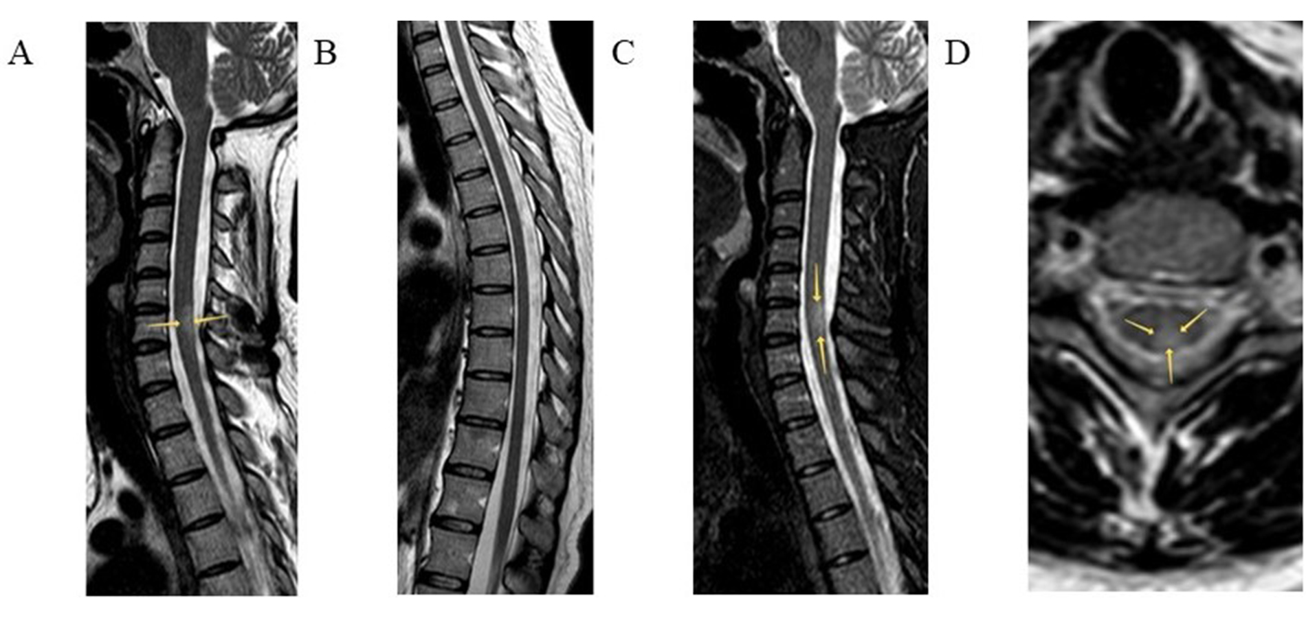 Spinal cord MRI of Patient 5. Sagittal T2 (A, B) and T2 weighted short tau inversion recovery (T2-STIR) (C) modes and axial T2 mode (D) are presented. Intramedullary, in the central and posterior regions of the spinal cord at the C6 level, a hyperintense lesion is visualized (arrows). Throughout the rest length, including the thoracic level, the spinal cord is intact, with homogeneous intensity of the magnetic resonance signal.