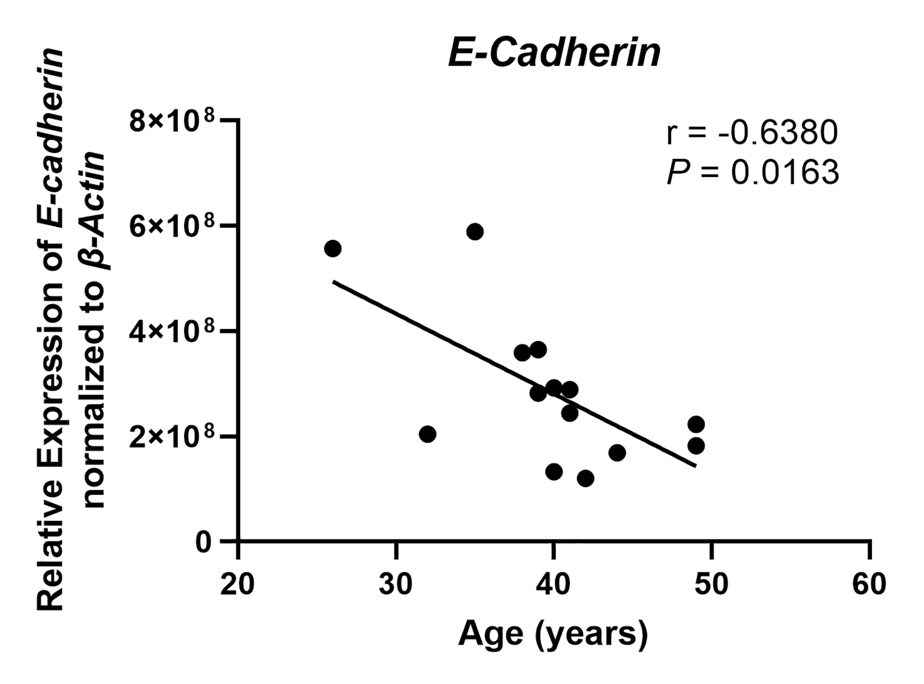 E-cadherin expression decreases with increasing age in premenopausal women. E-cadherin (CDH1) mRNA expression was determined by real-time reverse transcription-polymerase chain reaction (RT-PCR) for endometrial epithelial cells grown in vitro from premenopausal women (n = 14), isolated from either the proliferative or secretory phase, between the ages of 26–49 years. Expression is normalized to the expression of the housekeeping gene β-Actin. Each symbol represents an individual patient. Non-parametric Spearman correlation analysis