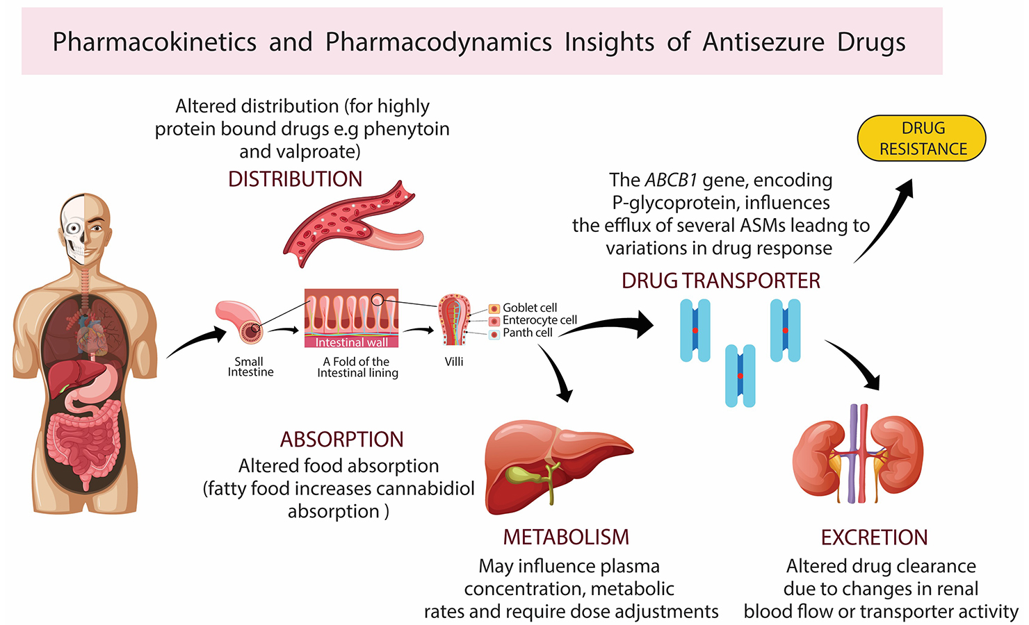 Pharmacokinetics and pharmacodynamics insights of antiseizure medications (ASMs). Pharmacokinetic and dynamic parameters, influenced by body condition and genetic variants like cytochrome P450 enzymes, P-glycoprotein, and others, impact drug absorption, distribution, metabolism, and excretion. Variants in target receptors such as voltage-gated sodium channels (e.g., SCN1A, SCN2A) alter drug efficacy, potency, and adverse effects, and may induce drug resistance. Created with BioRender.com
