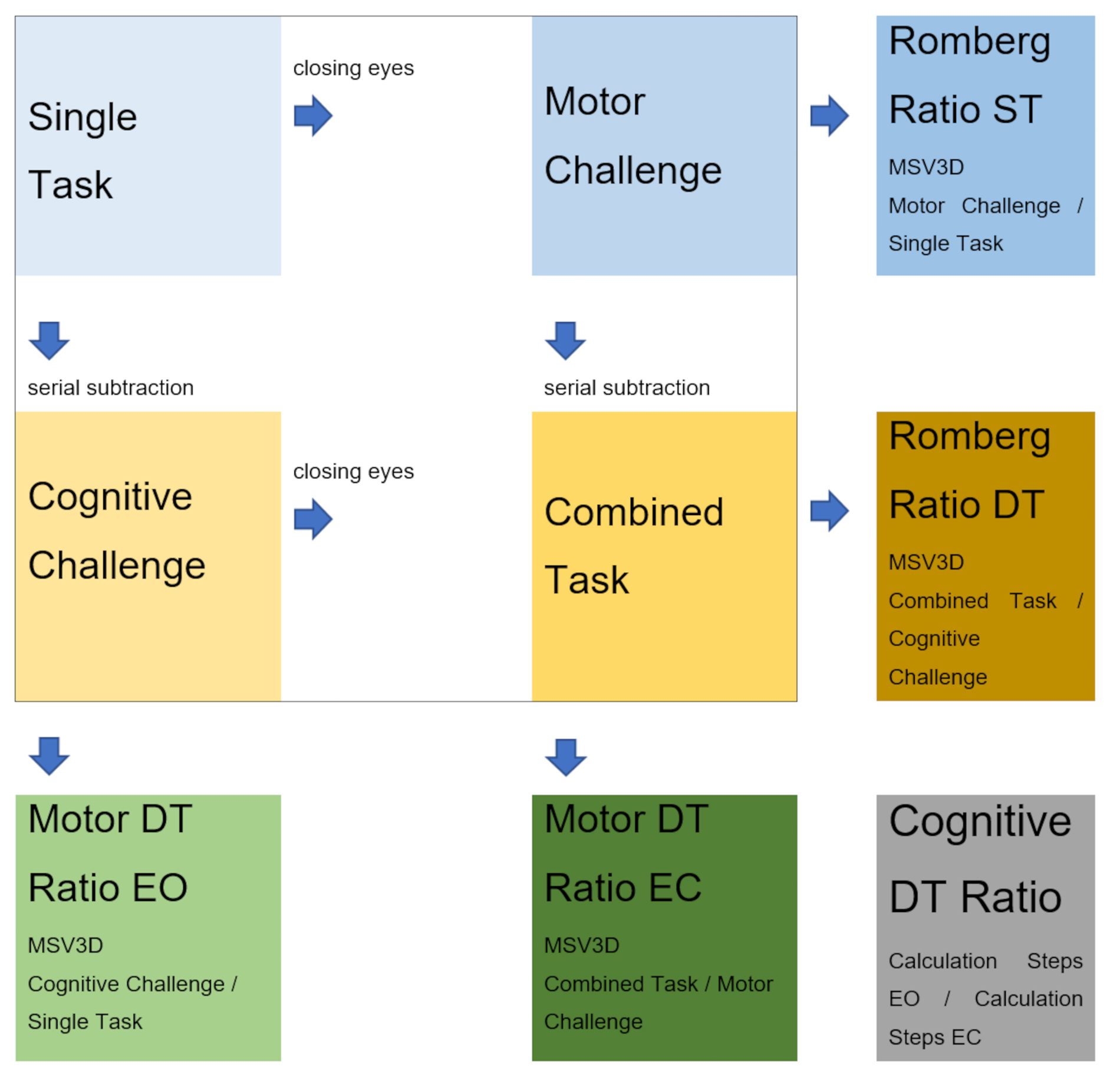 Scheme of the four posturography recording conditions [single task (ST) condition, dual task (DT) conditions, i.e., cognitive and motor challenge, and triple task condition, i.e., combined task] along with resulting data points and derivates used for analysis: Romberg ratios in ST and DT, and different DT ratios in open (EO) or closed eyes (EC) stance with usual footwear and closed feet. MSV3D: Mean angular Sway Velocity in 3D