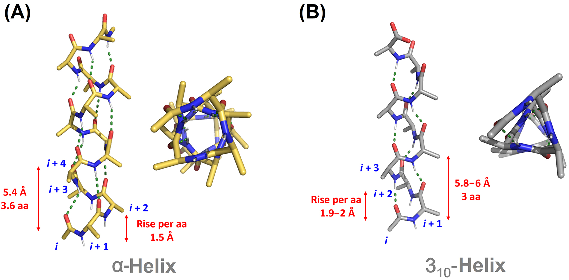 Comparison of canonical α-helical (A) and 310-helical (B) structures. aa: amino acid