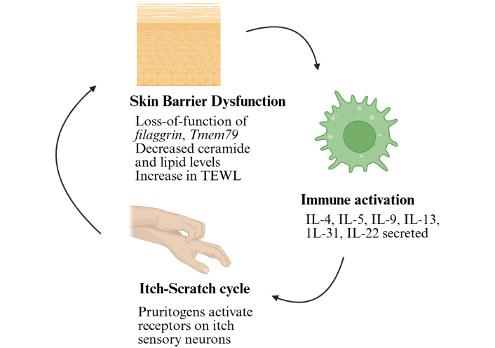 Mechanistic overview of atopic dermatitis. Various factors, such as loss-of-function mutations of filaggrin, Tmem79, or other structural proteins, a decrease in lipid and ceramide levels, and microbial colonisations, trigger immune activation, leading to the itch-scratch cycle. Tmem79: transmembrane protein 79; TEWL: transepidermal water loss; IL: interleukin. Created in BioRender. Arumugam, S. (2025) https://BioRender.com/iodrcxa.