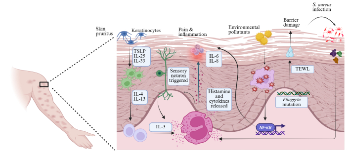 Cellular crosstalk in atopic dermatitis. Schematic representation of the complex cellular interactions in atopic dermatitis skin. The keratinocyte-immune-neuro crosstalk sustains pain, inflammation and itch. The gene mutations also create a self-perpetuating loop of barrier dysfunction, infection, inflammation and chronic pruritus. TSLP: thymic stromal lymphopoietin; IL: interleukin; TEWL: transepidermal water loss; S. aureus: Staphylococcus aureus. Created in BioRender. Arumugam, S. (2025) https://BioRender.com/iodrcxa.