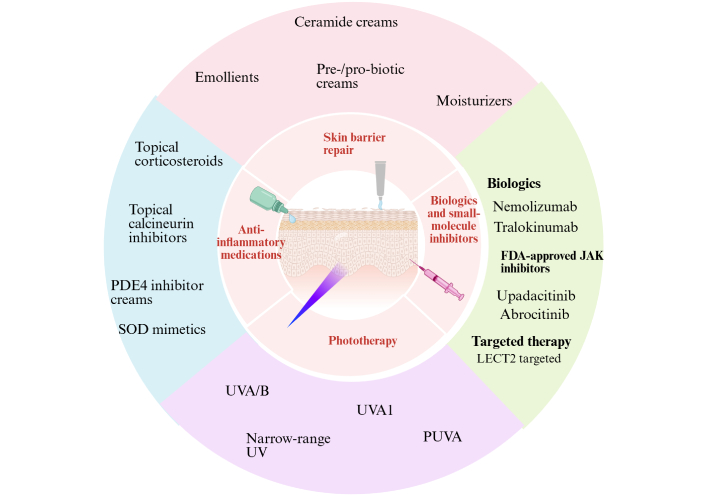 Various treatment modalities for AD. AD: atopic dermatitis; PDE4: phosphodiesterase 4; SOD: superoxide dismutase; UVA: ultraviolet A; PUVA: psoralen plus UVA; FDA: Food and Drug Administration; JAK: Janus kinase; LECT2: leukocyte cell-derived chemotaxin 2. Created in BioRender. Arumugam, S. (2025) https://BioRender.com/iodrcxa.