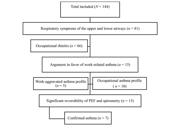 The WRA clinical profile included workers with either OA or WAA. These participants subsequently underwent peak expiratory flow (PEF) variability measurement and spirometry to confirm the asthma diagnosis. PEF variability was considered significant when there was an increase of PEF of at least 20% after bronchodilator administration compared to the pre-bronchodilator value [9]. Spirometry findings were consistent with asthma when a post-bronchodilation forced expiratory volume in one second (FEV1) increased by at least 12% and at least 200 mL in absolute value.