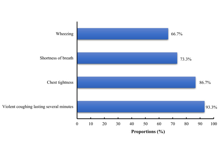 A WRA profile was identified in 10.4% of cases (15/144), including 10 cases of OA (95% CI: 3.8–12.3) and 5 cases of WAA (95% CI: 1.5–7.9), representing 6.9% and 3.5% of carpenters, respectively (Figure 1). Violent coughing fits lasting several minutes, and chest tightness were reported in 93.3% and 86.7% of cases, respectively (Figure 2).