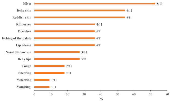 Cutaneous symptoms were the most frequent clinical manifestations among children with PA, with hives being the main reported complaint (72.7%), as illustrated in Figure 1.