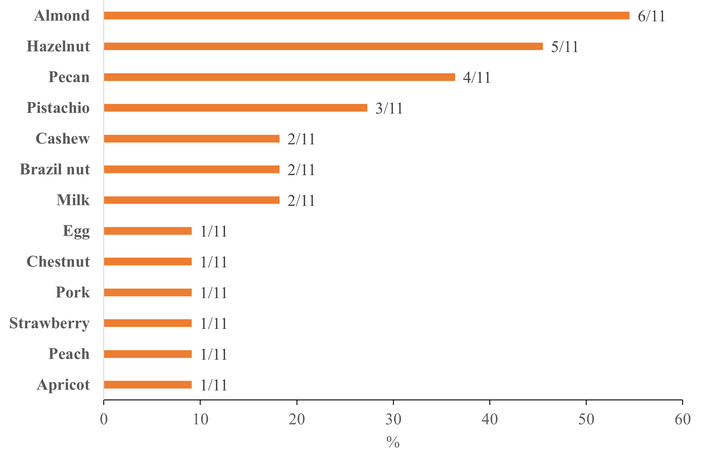 Among children with PA, other foods, particularly almonds (54.5%), hazelnuts (45.5%), and pecans (36.4%), were the most frequently associated allergens, as shown in Figure 2.