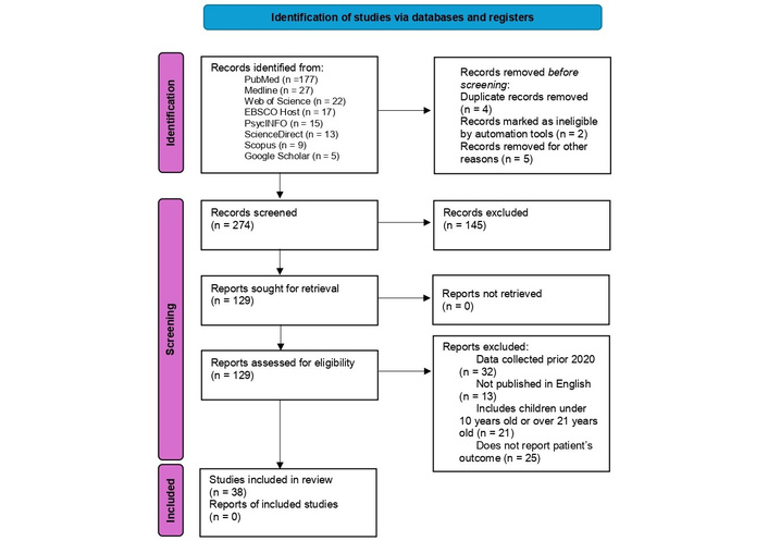 Of the 285 records reviewed, 38 were ultimately included in the review (Figure 1). The retrieved articles were divided into four topics: eight in mental health problems, fourteen in psychosocial risk factors, ten in protective psychosocial factors, and six in preventive and treatment strategies.