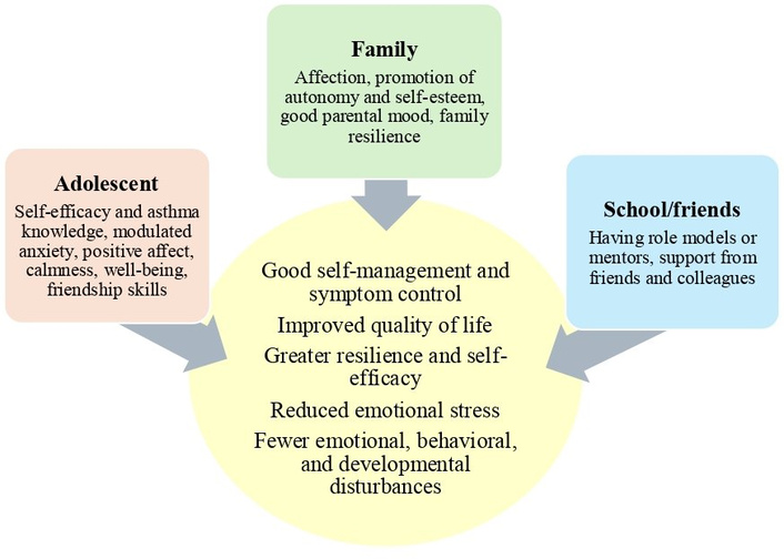 Knowledge and self-efficacy are considered protective factors in AA. Knowledge of the disease is useful and important in managing acute symptoms, which require a reactive approach (e.g., an asthma attack). However, self-efficacy is a more complex process that requires planning with an anticipatory focus and clear objectives, allowing the use of knowledge to prevent symptoms and support asthma self-control [40]. Both conditions have been linked to increased responsibility, better self-care, and quality of life in AA, and it is the duty of parents and health professionals to develop interventions to maintain and/or improve them [41]. Another factor that influences the care of AA is anxiety, which, at moderate levels, could be modulated by self-efficacy, to allow the adolescent to improve symptom prevention and self-care [42]. Positive affect in AA, and some of its components, such as vigor or vitality, well-being, happiness or satisfaction, and calmness, have been shown to reduce the psychological consequences of emotional stress [43]. Sleep hygiene is another factor that has been considered protective in adolescents, since those who have better sleep quality have better quality of life and attention at school [44]. Some family characteristics, such as the parents’ good mood or less psychological control, have been proposed as factors that favor the quality of life in AA [45, 46]. The ability to make and maintain friendships is associated with better personal development in the asthmatic adolescent, which in turn favors their resilience [47]. AAs who have mentors or who maintain good friendships with their peers have fewer emotional, behavioral, or developmental problems [48]. AAs who have peer support have better self-efficacy skills, which translates into better outcomes in their disease [49]. Table 4 shows the main characteristics of studies on protective biopsychosocial factors, and Figure 3 shows the benefit of biopsychosocial protective factors in AA.