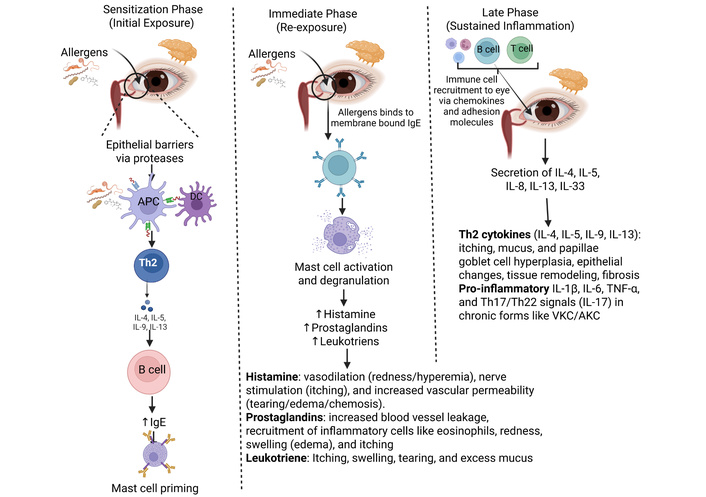 The reaction does not conclude once the initial surge of histamine fades. The late-phase response, which typically occurs 6–12 hours after allergen exposure. Following mast cell activation, a second wave of inflammation develops due to the de novo synthesis of inflammatory mediators such as prostaglandins and leukotrienes in tear fluid [1, 7, 14, 17] (Figure 1). Prostaglandins increase microvascular permeability, leading to worsening conjunctival hyperemia, increasing histamine-induced itching, and stimulating goblet cells, which increase mucus secretion. Leukotrienes work in tandem with histamine and prostaglandins to increase vascular permeability and promote oedema formation. The late phase is sustained by way of cellular infiltration into the conjunctiva [1, 7, 14]. Tumor necrosis factor α (TNF-α) up-regulates adhesion molecules such as intracellular adhesion molecule 1 (ICAM1), which facilitates leukocyte adhesion and migration into conjunctival tissue [7]. Furthermore, Th2 lymphocytes mature during this phase, which release IL-4, IL-5, and IL-13 cytokines. IL-4 and IL-13 specifically form giant papillae through conjunctival fibroblast stimulation and IgE overexpression. IL-5 acts on eosinophils to cause persistent inflammation and may increase long-term conjunctival damage [1] (Figure 1). These chemical messengers act as beacons, recruiting reinforcements from the bloodstream, specifically calling for eosinophils and Th2 cells [1, 2, 16, 17]. In chronic or severe clinical phenotypes, the persistent presence of these cells can lead to significant tissue remodeling and corneal complications. Recent research suggests that the conjunctival epithelium is not merely a passive barrier; it functions as a more active barrier. When stressed or damaged by allergens, it releases alarmins (such as TSLP, IL-33, and IL-25) that serve as master switches [16]. These proteins kickstart the innate immune pathways that sustain the inflammatory cycle and drive persistent disease.