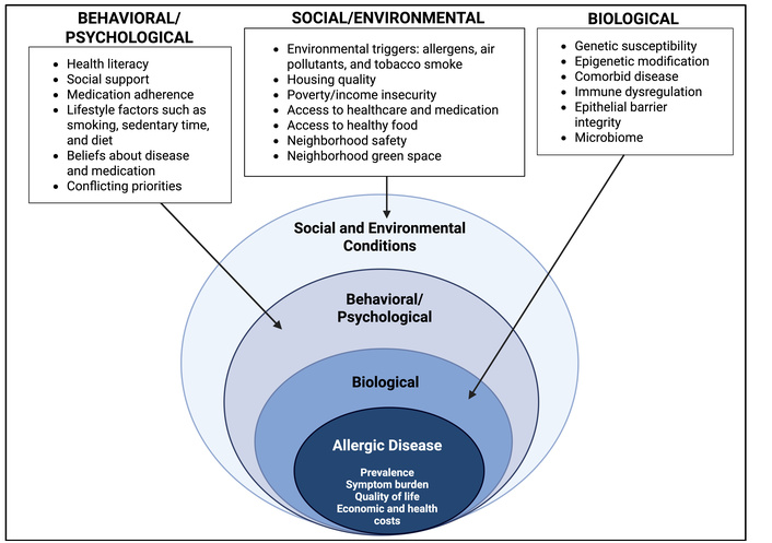 Biopsychosocial model of allergic disease. Created in BioRender. Burbank, A. (2026) https://BioRender.com/qju6pl0.