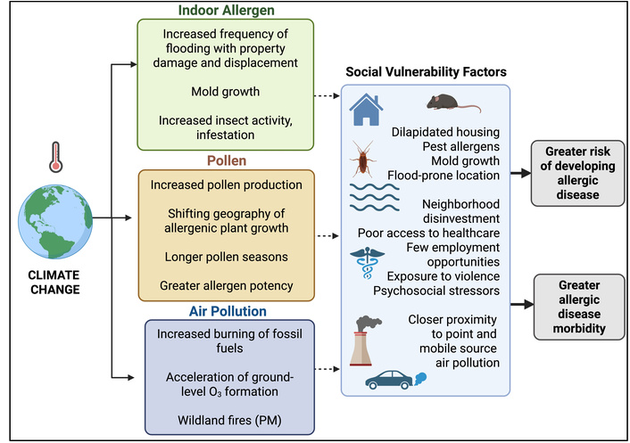 As our understanding of the impacts of human driven atmospheric and climate change on allergy sufferers continues to grow, we will continue to see the very real changes that our species has wrought upon itself. require integration with equity-focused policies and public health initiatives. The interplay between climate change and social vulnerability, and their combined influence on allergic disease outcomes, is not well characterized, particularly in low and middle income countries, but is of increasing importance due to the rise in global wealth inequality. The biopsychosocial model of disease explains health and illness as the result of the dynamic interaction among biological, behavioral, psychological, and social and environmental factors (Figure 1). Understanding the mechanisms linking climate change, air pollution, and allergic disease, as well as the modifying role of social vulnerability, is essential for developing comprehensive strategies to improve allergic disease outcomes. This review synthesizes current evidence on climate-related drivers of allergic disease, while exploring both the biological and social pathways that mediate these effects and highlighting strategies for risk mitigation and adaptation. Given the limited literature describing this relationship in low and middle income countries, this review primarily includes European and North American studies.