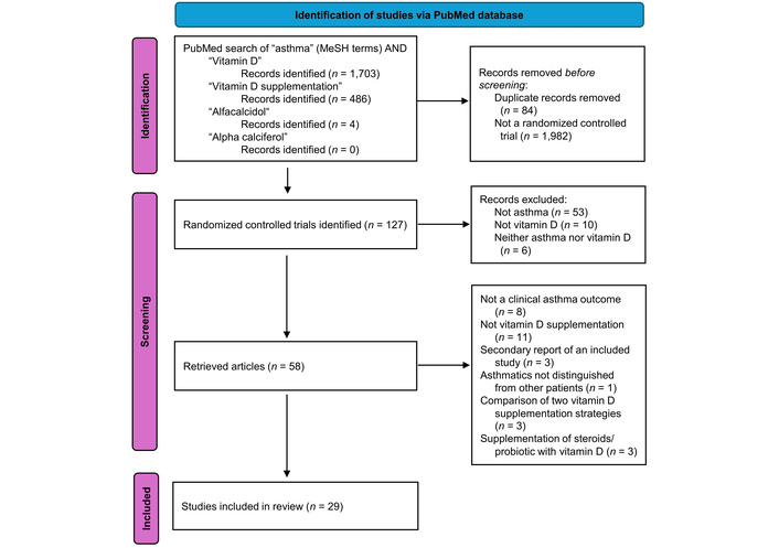 Flowchart of PubMed randomized controlled trials of vitamin D supplementation in asthma. Adapted from [7]. © 2021 The Author(s). Licensed under CC BY 4.0.