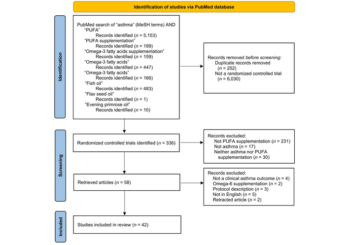Flowchart of PubMed randomized controlled trials of PUFA supplementation in asthma. PUFA: polyunsaturated fatty acid. Adapted from [7]. © 2021 The Author(s). Licensed under CC BY 4.0.