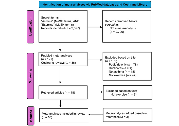 Flowchart of meta-analyses in the PubMed database and Cochrane Library review articles addressing asthma and exercise included in the review. Adapted from [7]. © 2021 The Author(s). Licensed under CC BY 4.0.