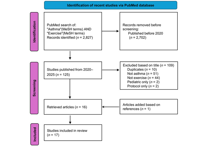Flowchart of new publications in the PubMed database from 2020 to October 2025 addressing asthma and exercise included in the review. Adapted from [7]. © 2021 The Author(s). Licensed under CC BY 4.0.