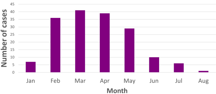 The distribution of cases according to months is shown in Figure 2. The incidence of Bordetella pertussis was higher in February, March, and April. Females were 53%, and 47% were males.