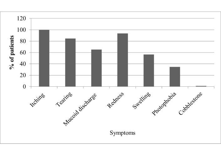 Among the 92 patients with AC, all reported experiencing itching, which was followed by redness and tearing. The least common symptom observed was cobblestone. This information is illustrated in Figure 1.