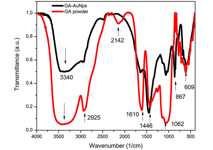 The broad peak at around 3,340 cm–1 is assigned to the N-H stretching vibration and the free O-H group. The peak at 2,925 cm–1 is associated with C-H stretching, and the band around 1,610 cm–1 corresponds to COO-symmetric stretching. The peak at 1,610 cm–1 is related to the C-O-C and C-OH vibrations of the protein/polysaccharide in GA. The peak at 1,446 cm–1 is assigned to COO- asymmetric stretching. The 1,200–900 cm–1 peaks are due to carbohydrates (polysaccharide structure). The peak at 867 cm–1 is attributed to the stretching vibration of the C-O bonds in the GA-AuNPs.
