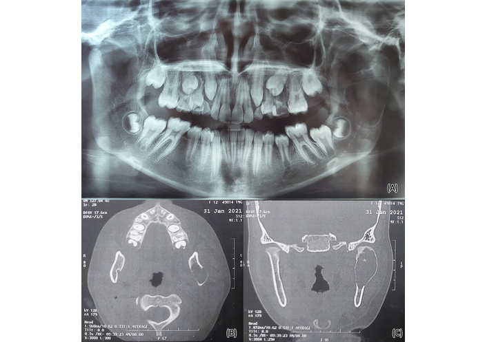Traumatic bone cyst of the left mandibular ramus and condyle. Panoramic X-ray film shows a left traumatic bone cyst related to the left ramus and condyle (A). Axial and coronal cuts CT shows a left traumatic bone cyst (B, C). Source from case No.3.
