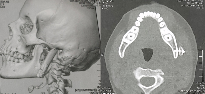 To ensure proper placement of the cartilage into the middle of the temporomandibular fossa, the cartilage was cut and shaped. A titanium plate with four holes was used to secure the graft to the lateral surface of the ramus with bicortical screws measuring 10 mm in length and 2 mm in diameter. To prevent reankylosis, temporal fascia was interposed in the joint space and secured with 3-0 Vicryl suture. Wound closure was performed in a layer-by-layer manner, where the muscle layer was closed and the skin was sutured with interrupted 3-0 Vicryl sutures. A pressure dressing was applied and changed every 12 hours for 4–5 days postoperatively.