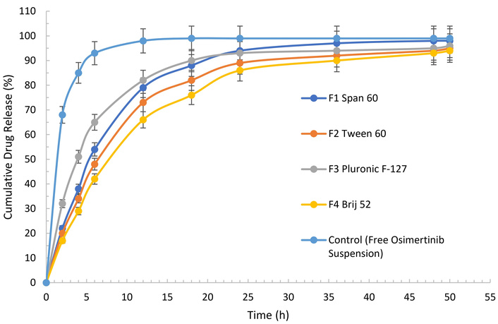 The in vitro release profiles of osimertinib from various niosomal formulations and a free drug suspension (control) were systematically compared (Figure 1). All niosomal formulations—F1 (Span 60), F2 (Tween 60), F3 (Pluronic F-127), and F4 (Brij 52)—demonstrated a sustained drug release pattern over 50 hours. In contrast, the control group containing free osimertinib suspension exhibited a rapid burst release, with approximately 68% of the drug released within the first 2 hours and over 85% released by 4 hours. Complete drug release from the free suspension was nearly achieved by 12 hours, exceeding 98%, and remained constant thereafter.