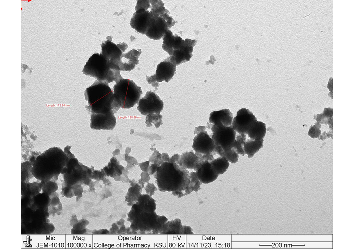 The TEM analysis of the F4 (Brij 52) niosomal formulation shows well-defined, predominantly spherical vesicles with distinct, uniform boundaries and sizes close to the nanoscale range (approximately 126 nm) (Figure 5). Negative staining with phosphotungstic acid highlights clear bilayer structures, and while minor aggregation is evident, most vesicles appear as separate, discrete particles.