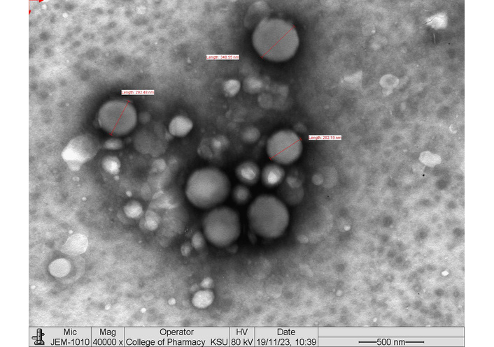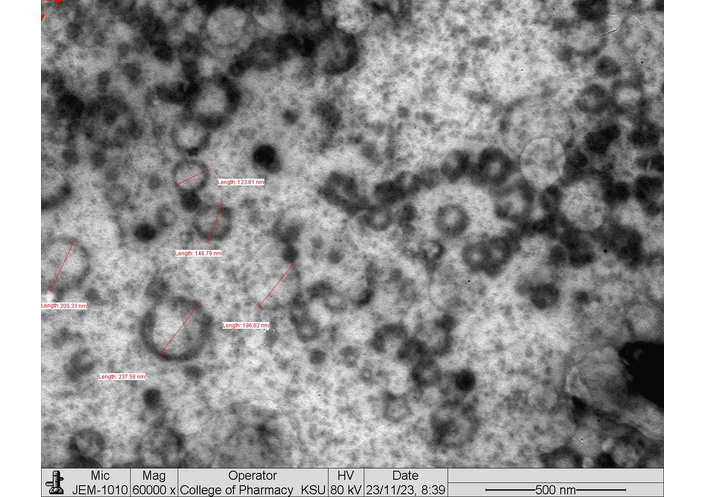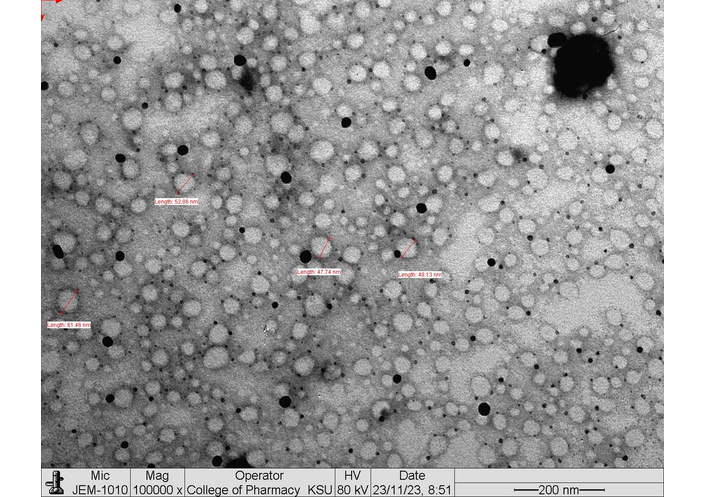 The morphology of prepared niosomal vesicles was characterized by transmission electron microscopy (TEM) using a JEOL JEM-1400 transmission electron microscope. A drop of the niosome sample was placed onto a carbon-coated copper grid and allowed to adsorb. Excess liquid was removed, and the grid was negatively stained with 2% phosphotungstic acid (pH 7.0) for 30–60 seconds, then air-dried at room temperature. The grids were examined using the JEOL JEM-1400 TEM at 80–120 kV, and images were captured at various magnifications to assess the size, shape, and surface characteristics of the vesicles.