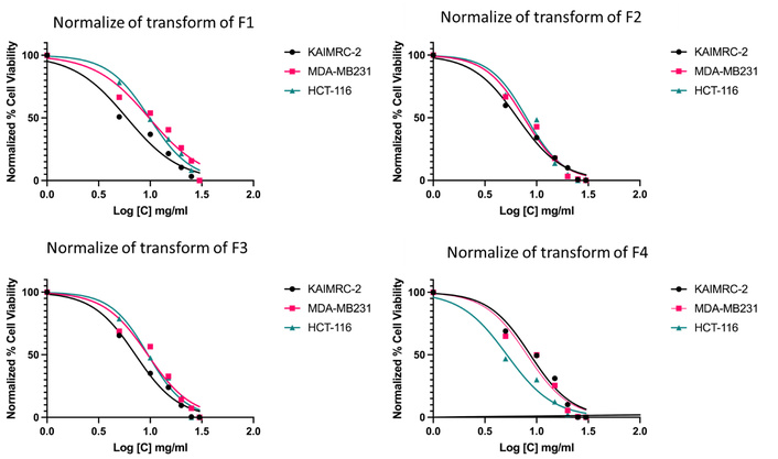 The cytotoxicity of the four osimertinib niosomal formulations—F1 (Span 60), F2 (Tween 60), F3 (Pluronic F-127), and F4 (Brij 52)—was evaluated in vitro against KAIMRC-2 (black circles), MDA-MB231 (magenta squares), and HCT-116 (cyan triangles) cell lines using a cell viability assay (Figure 6). All formulations demonstrated a clear, concentration-dependent decrease in cell viability across all tested cell lines. F1 (Span 60) exhibited the most pronounced cytotoxic effect, resulting in a lower percentage of viable cells at lower concentrations relative to the other formulations. F2 (Tween 60) and F4 (Brij 52) produced similar cytotoxicity profiles, generally with slightly higher cell viabilities at equivalent concentrations. The F3 (Pluronic F-127) formulation showed a moderate cytotoxic response overall. At 1.5 mg/mL, the viability of HCT-116 cells was comparable to that of the other cell lines, without clear evidence of increased resistance. Overall, the results confirm that surfactant type influences cytotoxic potency, with Span 60-based niosomes providing the most efficient cell viability reduction. No major differences in sensitivity were observed among the three cancer cell lines, though minor variations at specific concentrations may occur. These findings collectively support that osimertinib niosomes, especially those incorporating Span 60, can achieve effective and enhanced cytotoxic activity in vitro across multiple tumor cell models.