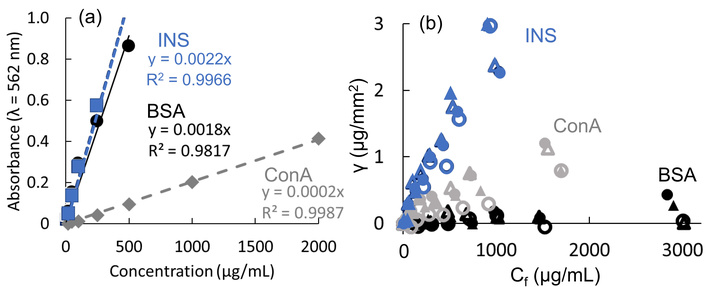 BCA Assay Quantities of Proteins. (a) Calibrations for BCA assay absorbances of heat-treated INS (blue), BSA (black), and ConA (gray), and (b) their adsorbed amounts γ on hydrophobic PTFE (closed triangles), hydrophilic PTFE (open triangles), hydrophobic PVDF (closed circles), and hydrophilic PVDF (open circles).