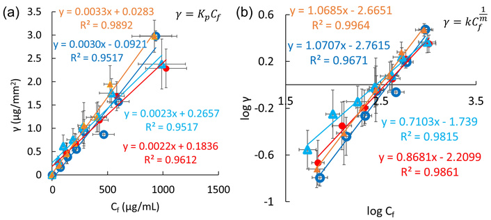 Analyses of INS adsorption. Hydrophilic (blue open circles) and hydrophobic PVDF (red closed circles), as well as hydrophilic (light blue open triangles) and hydrophobic PTFE (amber closed triangles), based on Henry’s equation (a) and Freundlich’s equation (b). Error bars on the ordinate and abscissa represent standard deviations from three or more experiments.
