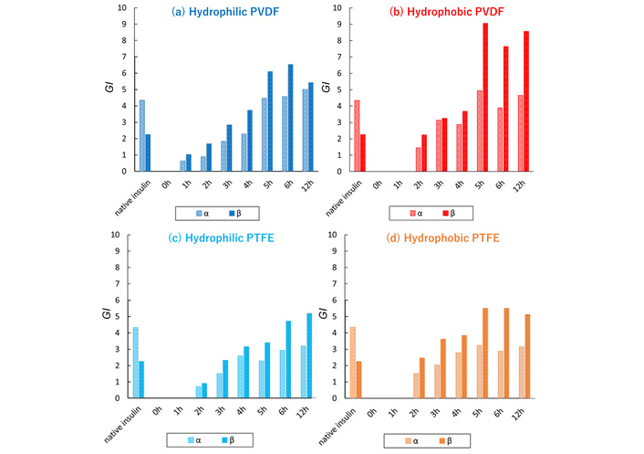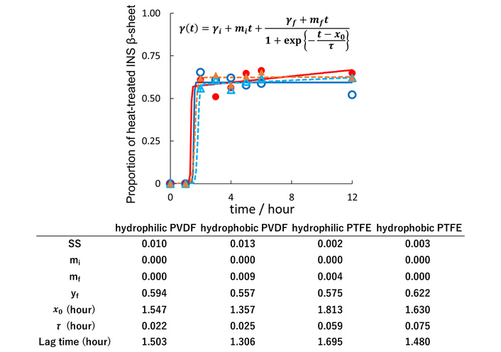 Figure 5 shows the change in thickness of the FCP membrane during the adsorption of heat-treated INS, which fits well with sigmoidal curves that increase steadily after a two-hour refractory period. These patterns are similar to the rise in β-sheet GI values shown in Figure 3. For the control FCPs without INS, the thicknesses of hydrophilic PVDF and hydrophilic PTFE membranes increased considerably after 12 hours, while both hydrophobic FCP membranes showed minimal change. Additionally, although Section “Adsorption isotherms of heat-treated proteins on the FCP membrane” indicated no remarkable difference in adsorption amount between hydrophobic and hydrophilic membranes, the difference in membrane thickness with and without INS adsorption after 12 hours was more noticeable for the hydrophobic membranes than for the hydrophilic membranes.