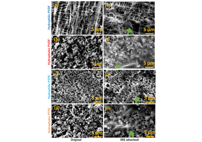 The proteins adsorbed on FCP membranes were not α-helix-rich BSA but β-sheet-rich ConA and heat-treated INS. Since heat-denaturation is believed to increase the β-sheets in INS, it can be concluded that adsorption on FCP membranes requires the presence of β-sheet-rich regions. When comparing FCP membranes, the FCP type (PVDF or PTFE) and hydrophobicity (hydrophobic or hydrophilic) had little effect on the amount of adsorbed protein.