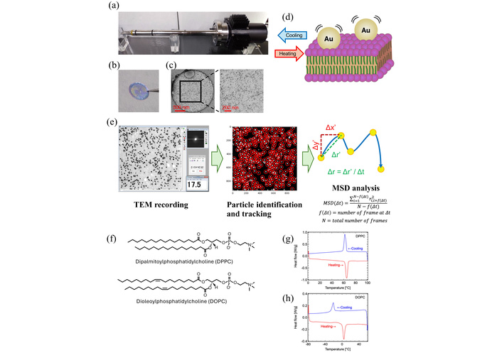 Experimental procedure and lipid membrane preparation. (a) Peltier-based heating/cooling TEM holder (KITANO SEIKI, Tokyo, Japan), enabling temperature control from –30°C to +100°C. (b) Lipid thin films formed across the holes of a Quantifoil Cu #200 R2/2 grid. (c) Representative TEM image of colloidal gold particles adsorbed on a DPPC membrane. (d) Magnified view of gold nanoparticles embedded on the lipid surface. (e) Flowchart of the data analysis process. Gold nanoparticles were used to observe thermal-induced phospholipid fluctuation using the electron microscopy. MSD of the gold nanoparticle movement was analyzed from the video data. (f) Chemical structures of DPPC (saturated) and DOPC (unsaturated). (g) Differential scanning calorimetry (DSC) thermograms of DPPC (dehydrated form) and (h) DOPC (dehydrated form), demonstrating their respective thermal transition behaviors.