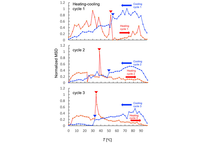 Temperature-dependent dynamics of DPPC membranes during repetitive thermal cycling. Normalized MSD of gold nanoparticles tracked on DPPC membranes during three repetitive heating and cooling cycles (0–98°C). MSD values were calculated at Δt = 8 s and normalized to the maximum value. Red and blue arrowheads indicate the phase-transition temperatures manually identified from the EBMD data.