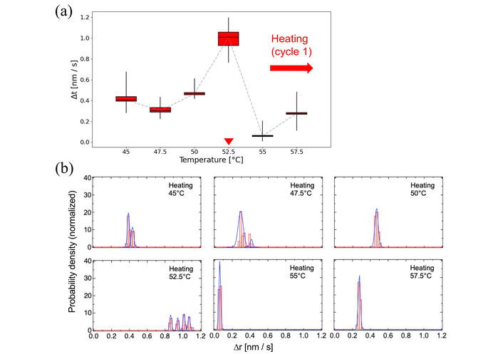 Molecular dynamics of DPPC membranes near the main phase transition during the first heating cycle. (a) Box plot representation of nanoparticle motion between 45–57.5°C. The box plots indicate the minimum, 25th percentile, median, 75th percentile, and maximum values. Red arrowhead indicates the phase-transition temperatures manually identified from the EBMD data. The original box plots spanning the wide-range temperature are shown in Figure S2a. (b) Probability density histograms of particle displacements at selected temperatures near 52.5°C. The histograms were fitted with single or multiple Gaussian curves to reveal the coexistence of heterogeneous motion modes.